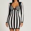 Made for the confident, style-driven woman, this black-and-white mini dress showcases a striking vertical stripe pattern, a structured bandage knit that contours every curve, and sleek long sleeves for runway-ready sophistication.